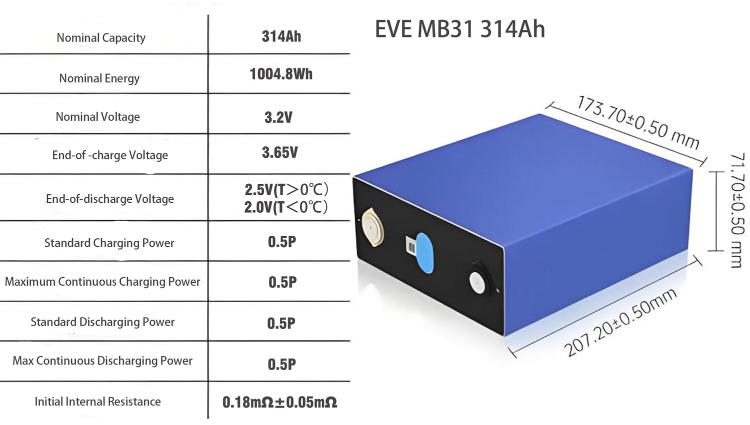 The EVE MB31 314Ah LiFePO4 Prismatic Battery is a high capacity lithium iron phosphate (LiFePO4) rechargeable battery known for its superior performance, safety and long life. With an impressive 314Ah capacity and high energy efficiency, this battery is ideal for small home energy storage systems and off-grid power solutions, providing long cycle life and stable power output.