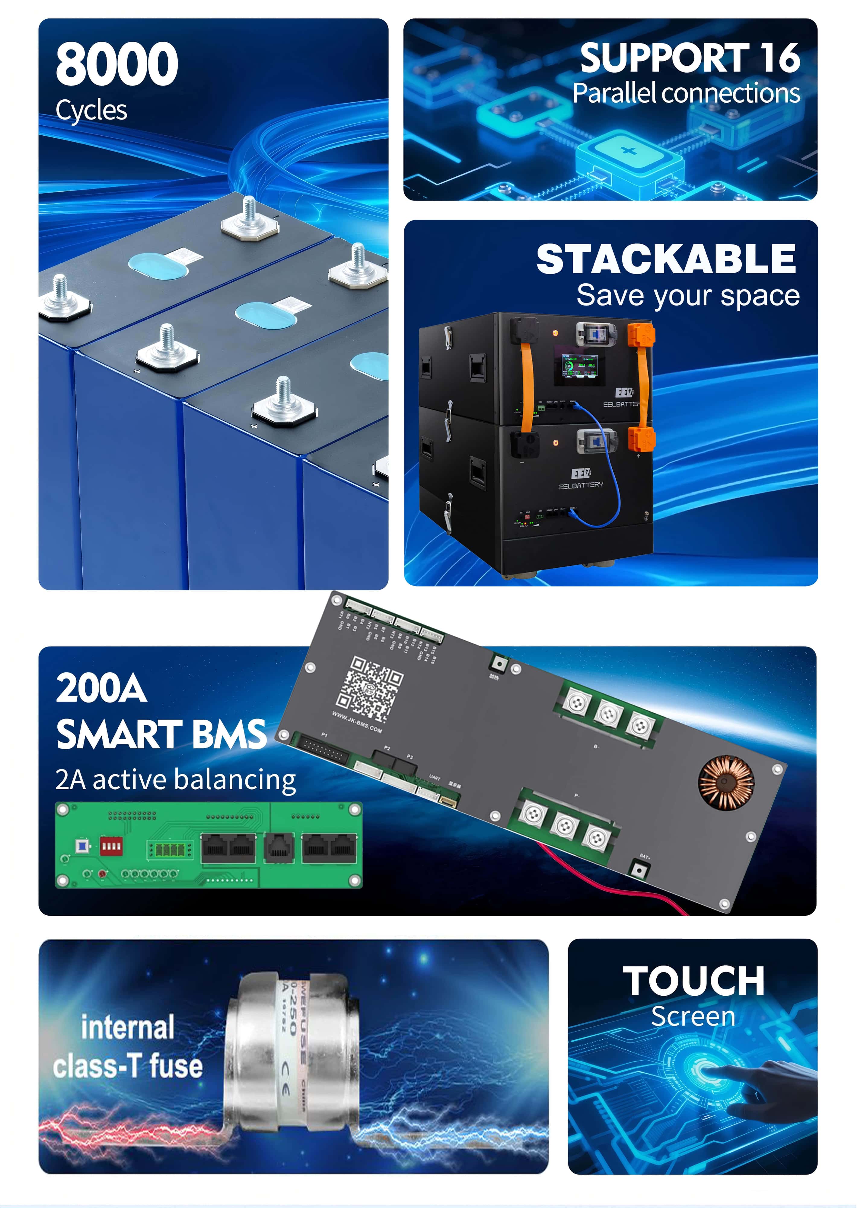 Our EEL V6 15kWh/16kWh LiFePO4 Solar Battery is engineered for large-scale residential and off-grid applications. Supporting parallel connection of up to 16 units, the system can deliver a total energy capacity of 256kWh or more, making it ideal for whole-home backup power, off-grid living, and renewable energy storage projects.